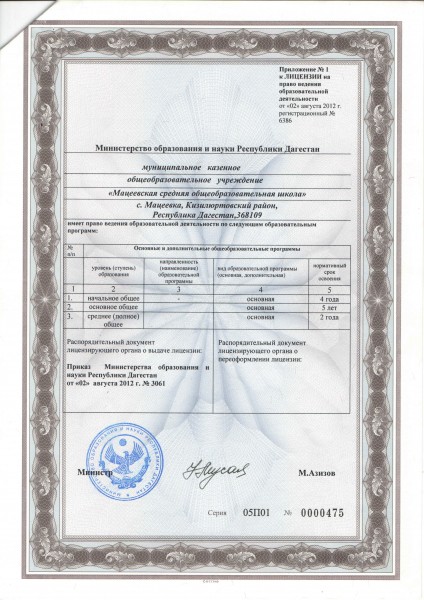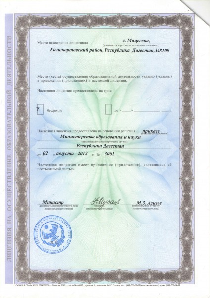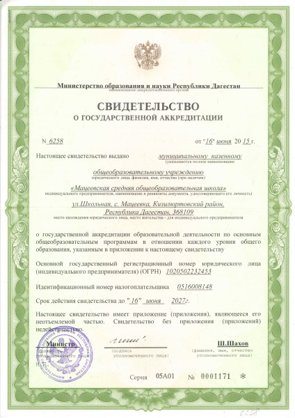 | Адрес местонахождения образовательной организации* | 368109, Республика Дагестан, Кизилюртовский район, селение Мацеевка ул. Школьная 1 |